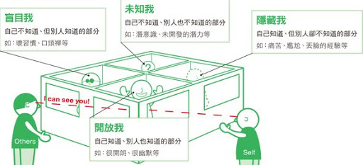 B.盲目自我(blind self):自己看不到,他人卻一目瞭然的區域,也就是所謂的盲點,包含一些個人未意識到的習慣或口頭禪,不一定全部是缺點。